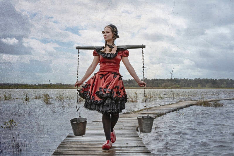 The photo series WATERDRAGEN ("carrying water), tells a poetic story about awareness and hope. 'Nature is on RED ALERT', is the deeper message that lies behind this partially staged visual narrative. A farm girl, dressed in red, wanders through the landscape of Huis ter Heide. Aware of the environmental issues, she seeks to help the area’s nature survive in her own whimsical way. Instead of milking cows, she carries buckets of water into the forest, balanced on a wooden yoke across her shoulders, quenching the thirst of the trees. The nearby fens serve as a ‘source of life.’ But these natural water sources must be allowed to endure.